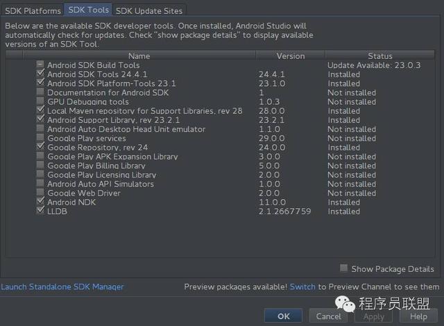 1. 安裝LLDB:(LLDB是Low Level DeBugger 的縮寫,是LLVM的子項目。LLVM在下面補充知識部分有介紹,就不贅述了)。依次Tools->Android->SDK Manager, 然後點擊 "SDK Tools" 的Tab標簽,勾選LLDB。點擊 "Apply"以安裝LLDB。