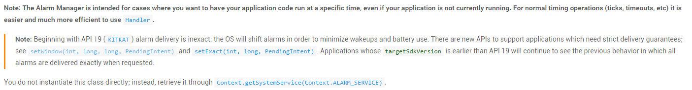 另外要注意一點的是,AlarmManager主要是用來在某個時刻運行你的代碼的,即時你的APP在那個特定 時間並沒有運行!還有,從API 19開始,Alarm的機制都是非准確傳遞的,操作系統將會轉換鬧鐘 ,來最小化喚醒和電池的使用!某些新的API會支持嚴格准確的傳遞,見 setWindow(int, long, long, PendingIntent)和setExact(int, long, PendingIntent)。 targetSdkVersion在API 19之前應用仍將繼續使用以前的行為,所有的鬧鐘在要求准確傳遞的情況 下都會准確傳遞。更多詳情可見官方API文檔:AlarmManager