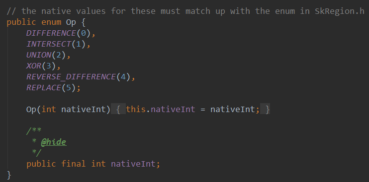 其實難點無非這個,Region代表著區域,表示的是Canvas圖層上的某一塊封閉區域! 當然,有時間你可以自己慢慢去扣這個類,而我們一般關注的只是他的一個枚舉值:Op