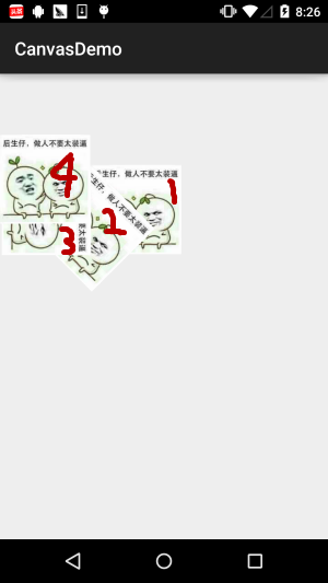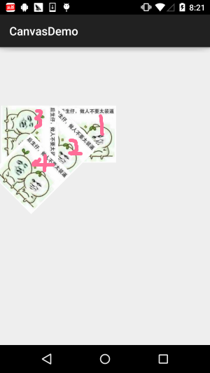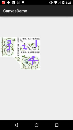 canvas.save(); canvas.translate(300, 300); canvas.drawBitmap(bmp, 0, 0, mPaint); canvas.save(); canvas.rotate(45); canvas.drawBitmap(bmp, 0, 0, mPaint); canvas.save(); canvas.rotate(45); canvas.drawBitmap(bmp, 0, 0, mPaint); canvas.save(); canvas.translate(0, 200); canvas.drawBitmap(bmp, 0, 0, mPaint);