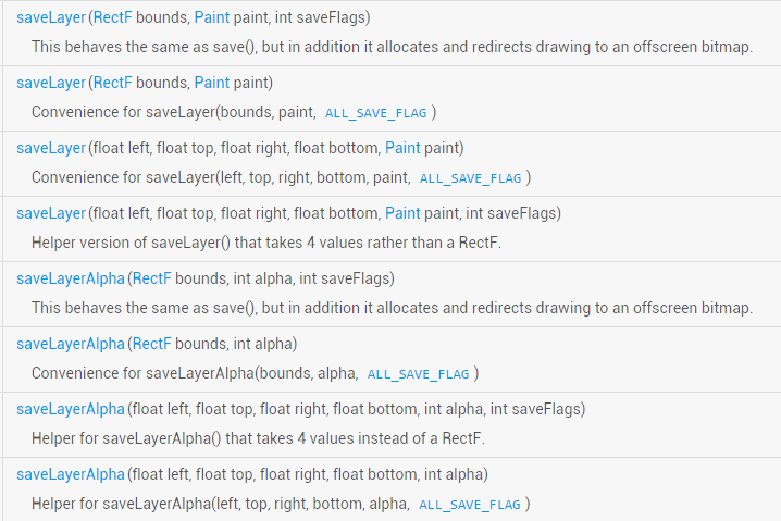 其實這兩個方法和save以及restore大同小異,只是在後者的基礎上多了一些東東而已, 比如saveLayer(),有下面多個重載方法: