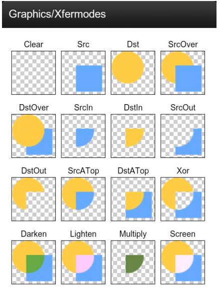 而這節則是利用PorterDuff.Mode中的DST_IN模式來實現,話不多說,開始本節內容! PS:本節例子采自弘洋大神的——Android Xfermode 實戰 實現圓形、圓角圖片 另外,還是要貼下PorterDuff.Mode的效果圖: