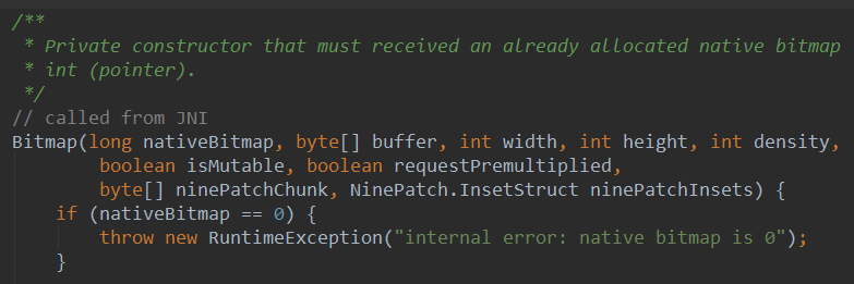 如果你打開Bitmap類的源碼,你會看到Bitmap的構造方法上有這樣一段東東: