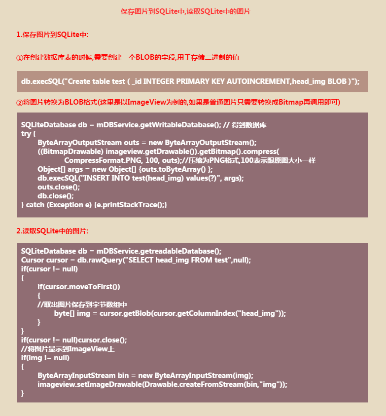 當然,一般我們很少往數據庫中存儲大二進制文件,比如圖片,音頻,視頻等,對於這些我們一般 是存儲文件路徑,但總會有些奇葩的需求,某天你突然想把這些文件存到數據庫裡,下面我們以 圖片為例子,將圖片保存到SQLite中,以及讀取SQLite中的圖片!