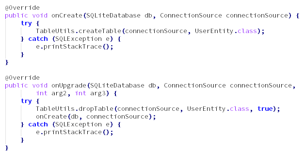 public void onUpgrade(SQLiteDatabase db, ConnectionSource connectionSource, int arg2, int arg3) { switch(arg2){ case 1: db.execSQL(第一個版本的建表語句); case 2: db.execSQL(第二個版本的建表語句); case 3: db.execSQL(第三個版本的建表語句); } }細心的你可能發現這裡並沒有寫break,這就對了,這是為了保證跨版本升級時,每次數據庫 修改都能全部執行到!這樣可以保證表結構都是最新的!另外不一定是建表語句,修改表結構 也可以哦!