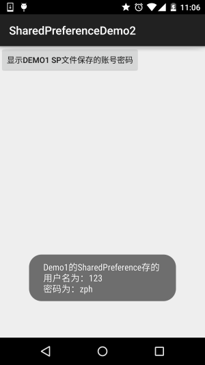 Toast.makeText(getApplicationContext(), "Demo1的SharedPreference存的\n用戶名為:" + name + "\n密碼為:" + passwd, Toast.LENGTH_SHORT).show();
