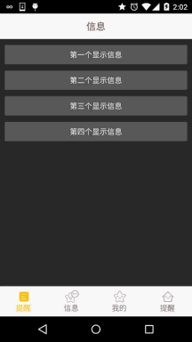 從上面這個圖我們就可以看出,這種底部導航欄不是簡單的TextView或者RadioGroup構成的, 大概布局方案可能是:外層一個LinearLayout,中間一個RelativeLayout,而在中間有一個TextView, 然後再在TextView的右上角有一個紅色圓圈背景的TextView或者一個紅色的小點; 大概就這樣,而這些小點平時的時候應該設置的不可見,當收到信息推送,即有相關類別信息的 時候再可見,並且顯示對應的信息數目!那麼下面我們就來實現下這種底部導航欄的效果, 另外,為了方便演示,這裡就不演示Fragment的切換效果了!另外順道復習下Fragment獲得Activity 中的組件的知識點!