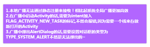 PS:本地廣播無法通過靜態注冊方式來接受,相比起系統全局廣播更加高效