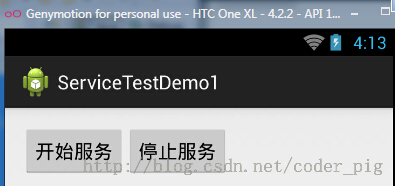 再接著是簡單的布局文件,兩個按鈕,再最後是MainActivity的編寫,在按鈕的點擊事件中分別 調用startService( )和stopService( )!