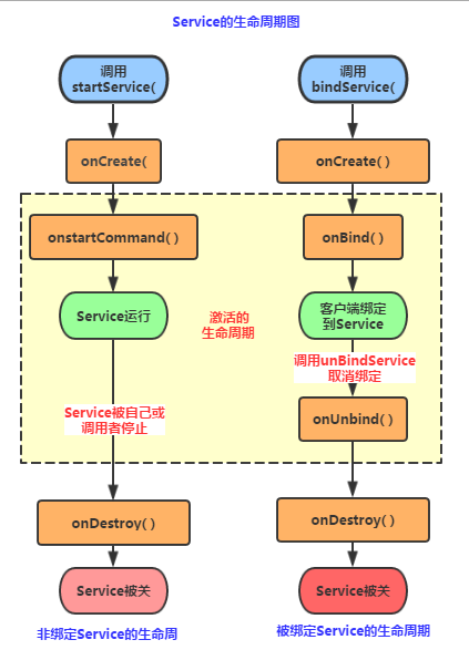 好的,從上圖的生命周期,我們可以知道,Android中使用Service的方式有兩種: