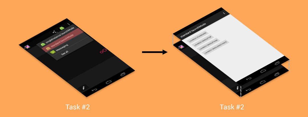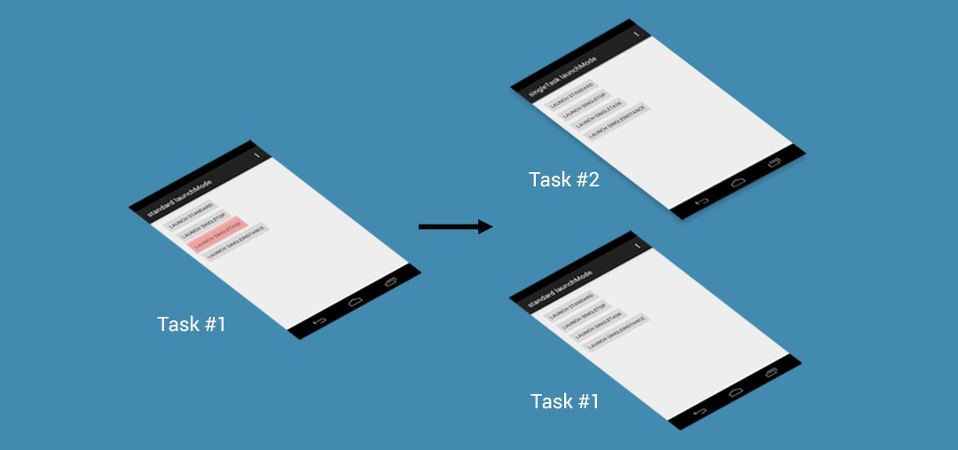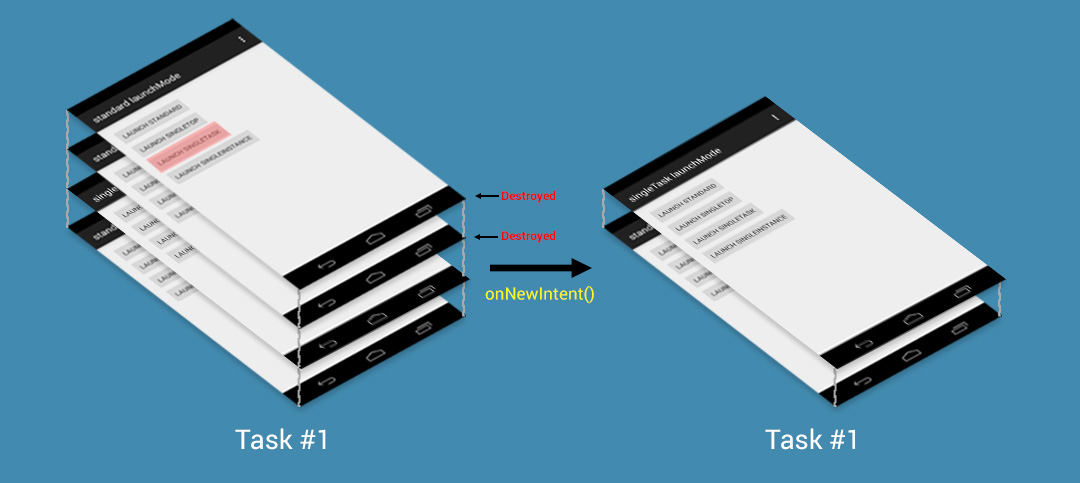 - 啟動singleTask模式的Activity時,會在系統中搜尋是否已經存在一個合適的Task,若存在,則會將這個Task調度到前台以重用這個Task。如果這個Task中已經存在一個要啟動的Activity的實例,則清除這個實例之上的所有Activity,將這個實例顯示給用戶。如果這個已存在的Task中不存在一個要啟動的Activity的實例,則在這個Task的頂端啟動一個實例。若這個Task不存在,則會啟動一個新的Task,在這個新的Task中啟動這個singleTask模式的Activity的一個實例。