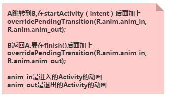 <!-- 默認Activity跳轉動畫 --> <style name="default_animation" mce_bogus="1" parent="@android:style/Animation.Activity"> <item name="android:activityOpenEnterAnimation">@anim/default_anim_in</item> <item name="android:activityOpenExitAnimation">@anim/anim_stay</item> <item name="android:activityCloseEnterAnimation">@anim/anim_stay</item> <item name="android:activityCloseExitAnimation">@anim/default_anim_out</item> </style>