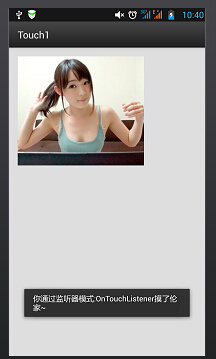 Toast.makeText(getApplicationContext(),"你通過監聽器模式:OnTouchListener摸了倫家~",Toast.LENGTH_LONG).show();
