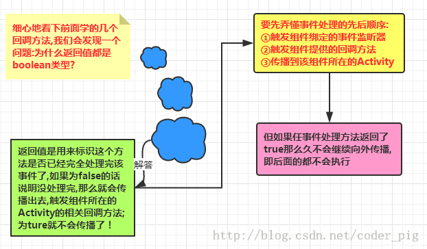 本節對Android事件處理機制中的基於回調的事件處理機制進行了講解!核心就是事件傳播的順序 監聽器優先,然後到View組件自身,最後再到Activity;返回值false繼續傳播,true終止傳播~!