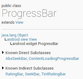 ProgressBar繼承與View類,直接子類有AbsSeekBar和ContentLoadingProgressBar, 其中AbsSeekBar的子類有SeekBar和RatingBar,可見這二者也是基於ProgressBar實現的