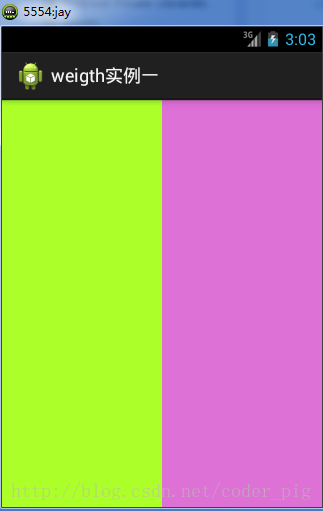 要實現第一個的1:1的效果,只需要分別把兩個LinearLayout的weight改成1和1就可以了 用法歸納: 按比例劃分水平方向:將涉及到的View的android:width屬性設置為0dp,然後設置為android weight屬性設置比例即可;類推,豎直方向,只需設android:height為0dp,然後設weight屬性即可! 大家可以自己寫個豎直方向的等比例劃分的體驗下簡單用法!