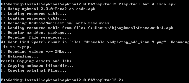 接下來,雙擊cmd.exe,來到命令行,鍵入: apktool.bat d csdn.apk 即可,Enter回車: