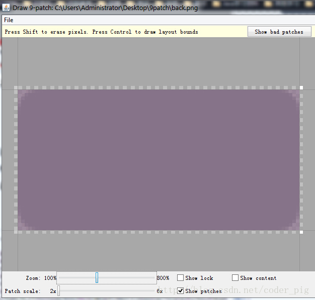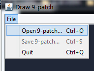 打開我們的draw9patch.bat,點擊左上角File,來到對應目錄打開我們要處理的圖片素材, 接下來就可以看到我們工具的主界面了: