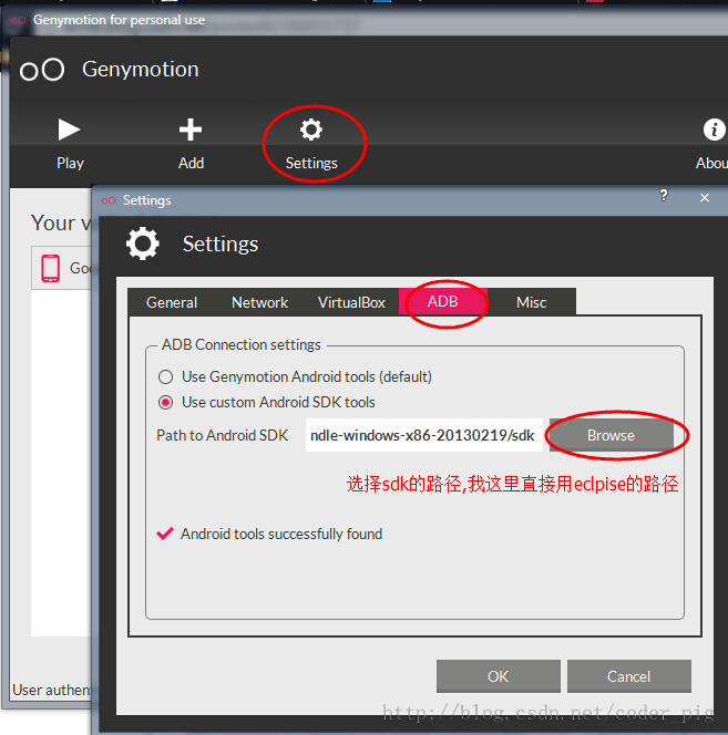 答:在下載設備驅動時其實已經下載好對應的sdk了,但是如果你不喜歡的話可以 打開setting--ADB-->選擇Eclpise的sdk路徑