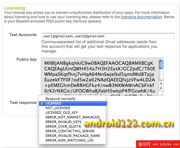 1. 在Market發布頁面可以找到Licensing這項,我們可以加入開發者的測試Gmail賬戶,下面生成的是你的公鑰,當然從大小寫和結尾的=來看是Base64編碼的,如圖