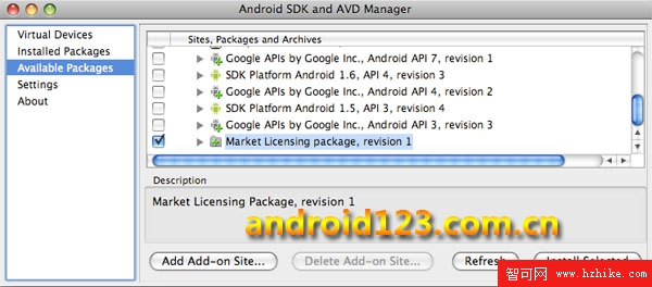 Android反盜版保護LVL的實戰具體使用,首先我們在Eclipse中打開android SDK and AVD Manager,選擇Available Packages這項,單擊Refresh可以找到Market Licensing package,revision 1這項,我們單擊Install Selected即可,如圖
