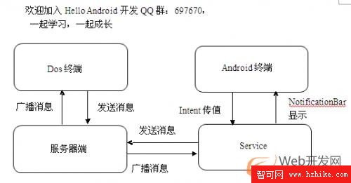 效果圖的意思是,android的客戶端通過綁定Service與服務器端進行了連接,並發送消息。服務器向所有正在連接的客戶端廣播消息。