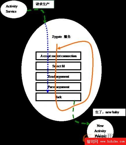 通過這兩個單詞,我們就可以大體知道Zygote是干什麼的了,就是叫老母雞下蛋。通過“Zygote”產出不同的子“Zygote”。從大的架構上講,Zygote是一個簡單的典型C/S結構。其他進程作為一個客服端向Zygote發出”孵化”請求,Zygote接收到命令就“孵化”出一個Activity進程來。