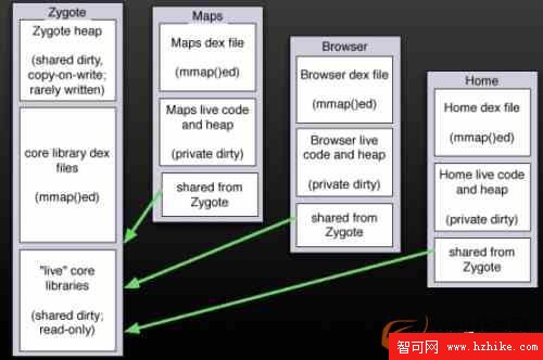 再看看下面Google在講解Dalvik虛擬機的圖片,我們就大體有了android系統中Actvitiy的實際映射狀態有了基本的認識。