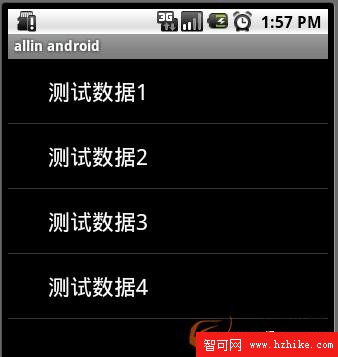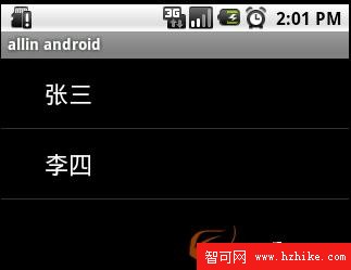 上面代碼使用了ArrayAdapter(Context context, int textViewResourceId, List objects)來裝配數據,要裝配這些數據就需要一個連接ListVIEw視圖對象和數組數據的適配器來兩者的適配工作,ArrayAdapter的構造需要三個參數,依次為this,布局文件(注意這裡的布局文件描述的是列表的每一行的布局,android.R.layout.simple_list_item_1是系統定義好的布局文件只顯示一行文字,數據源(一個List集合)。同時用setAdapter()完成適配的最後工作。運行後的現實結構如下圖: