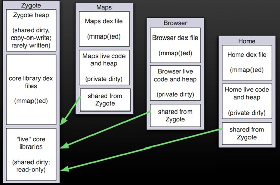 而在系統需要一個新的虛擬機實例時,Zygote通過復制自身,最快速的提供個系統。另外,對於一些只讀的系統庫,所有虛擬機實例都和Zygote共享一塊內存區域,大大節省了內存開銷。
