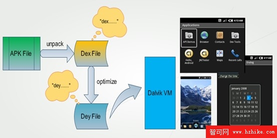 應用程序包(APK)被發布到手機上後,運行前會對其中的DEX文件進行優化,優化後的文件被保存到緩存區域(優化後的格式被稱為DEY),虛擬機會直接執行該文件。如果應用包文件不發生變化,DEY文件不會被重新生成。