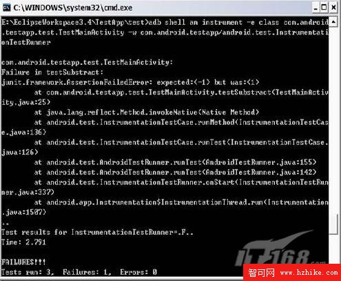 可以看到,單元測試正確的找到了減法中的錯誤。結果中的成功的測試顯示為”.”,一個失敗的顯示為”F”。只不過我還是不太理解為什麼我只寫了兩個測試方法,Tests run卻顯示了3。