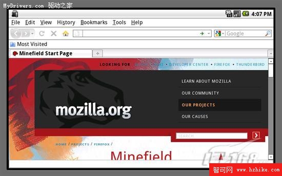 這張截圖並非是手機界面的截圖,而是運行在android模擬器上的畫面,因為運行android系統的設備不僅有手機,還有上網本和平板電腦等其他設備,現在開發團隊正在測試浏覽器軟件的完整界面,以保證android版Firefox能在各種設備中正常運行。