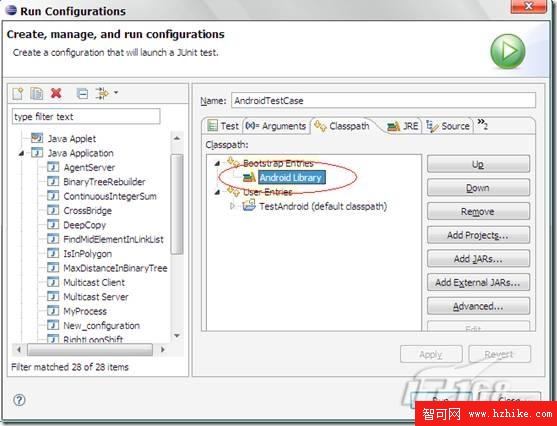 只不過在運行單元測試時,一定要用JDK來運行,利用Java命令來啟動JUnit的某個Runner。如果是用Eclipse的話。可以在Run Configuration裡新建一個JUnit。但是一定要記得在Classpath選項卡裡將Bootstrap EntrIEs中的android Library改成JRE,並且添加junit.jar。
