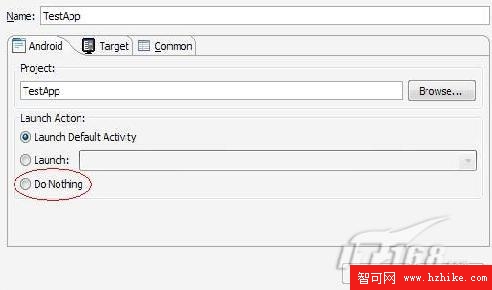 在 Eclipse上,這兩個步驟是一起完成的。只要點一下Run即可。只不過如果你不在Run Configuration裡將安裝後的Launch Action設為“Do Nothing”,就會自動運行一下你的MainActivity。對於我們,設為Do Nothing即可。如下圖: