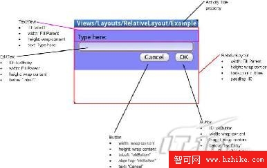 如果使用XML來指定這個layout,在你定義它之前,被關聯的元素必須定義。這是一個android應用程序例子,其中有可視的和不可視的元素。基礎的屏幕layout對象是一個RelativeLayout對象。