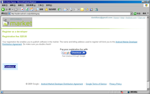 首先,要發布Android程序至android Market,必須先支付一筆25塊美金的注冊費,以下步驟為說明如何注冊android Market Account、sign(簽署)應用程序,並發布應用程序至Market的過程。