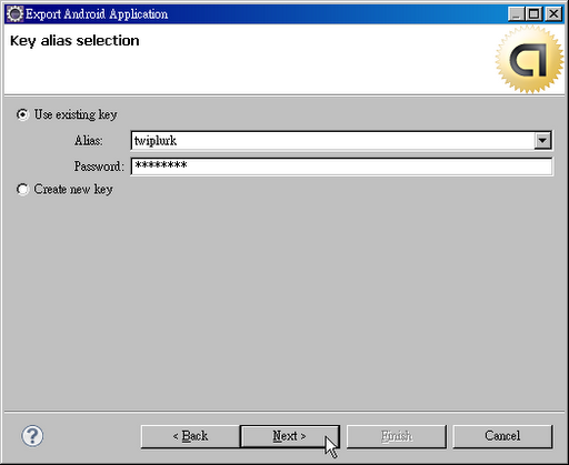 14.利用下拉選單選擇可用的Alias,並輸入方才建立keystore所使用的密碼。