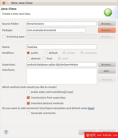 通過菜單File → New → Class.在BrewClock項目中創建一個TeaData的新類。確保TeaData擴展於android.database.sqlite.SQLiteOpenHelper 類,並選中“Constructors from superclass”復選框。