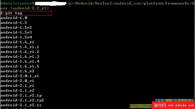 5、使用 "git tag" 命令,顯示所有的android的源代碼工程名稱;