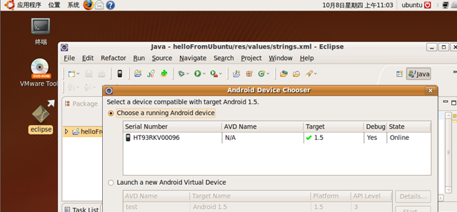 現在運行修改後的 Hello World!應用程序。假設創建了AVD 並同時做了環境設置。要在Eclipse運行的應用程序,打開一個項目的活動文件,從工具欄上找到並單擊 “run”