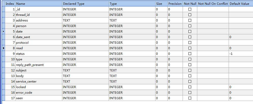 下面來分析一下代碼:第一個按鈕通過ContentProvider間接獲取了一些短信的信息,保存在一個List數組下。我們先導出Android系統的sms表看一下: