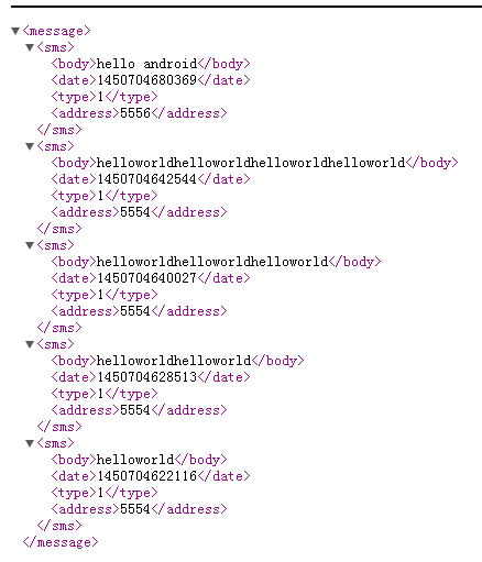 總共有17個字段這麼多,顯然不是我們都關心的,這裡只要了address,date, body, type四個字段,分別表示對方號碼,短信時間,短信內容,發送還是接收。第二個按鈕把短信相關信息存儲在一個序列化的XML文件中,方便查看。