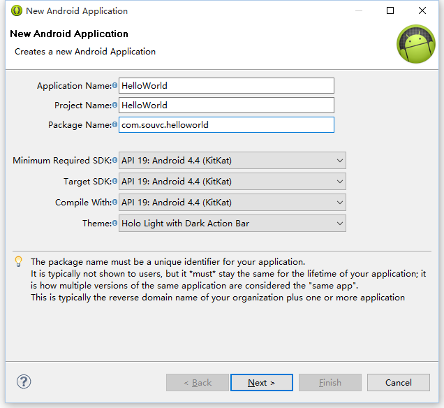 4. 填寫應用名字,項目名字和包名。