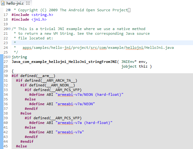 eclipse的ndk開發環境建差不多後打開jni的samples裡的hello-jni項目。添加native和運行都沒有問題,但是打開hello-jni.c看到一片紅: