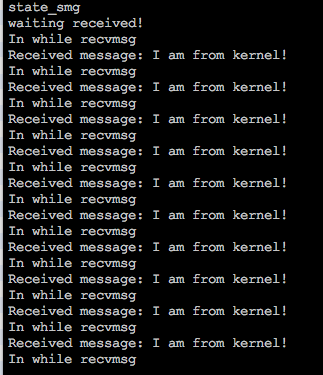 這個結果復合我們的預期,但是運行過程中打印出“state_smg”卡了好久才輸出了後面的結果。這時候查看客戶進程是處於D狀態的(不了解D狀態的同學可以google一下)。這是為什麼呢?因為進程使用Netlink向內核發數據是同步,內核向進程發數據是異步。什麼意思呢?也就是用戶進程調用sendmsg發送消息後,內核會調用相應的接收函數,但是一定到這個接收函數執行完用戶態的sendmsg才能夠返回。我們在內核態的接收函數中調用了10次回發函數,每次都等待3秒鐘,所以內核接收函數30秒後才返回,所以我們用戶態程序的sendmsg也要等30秒後才返回。相反,內核回發的數據不用等待用戶程序接收,這是因為內核所發的數據會暫時存放在一個隊列中。