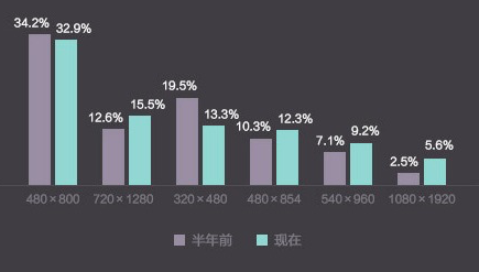 下圖是2014年初,友盟統計的占比5%以上的6個主流分辨率,可以看出,占比最高的是480*800,320*480的設備竟然也占據了很大比例,但是和半年前的數據相比較,中低分辨率(320*480、480*800)的比例在減少,而中高分辨率的比例則在不斷地增加。雖然每個分辨率所占的比例在變化,但是總的趨勢沒變,還是這六種,只是分辨率在不斷地提高。