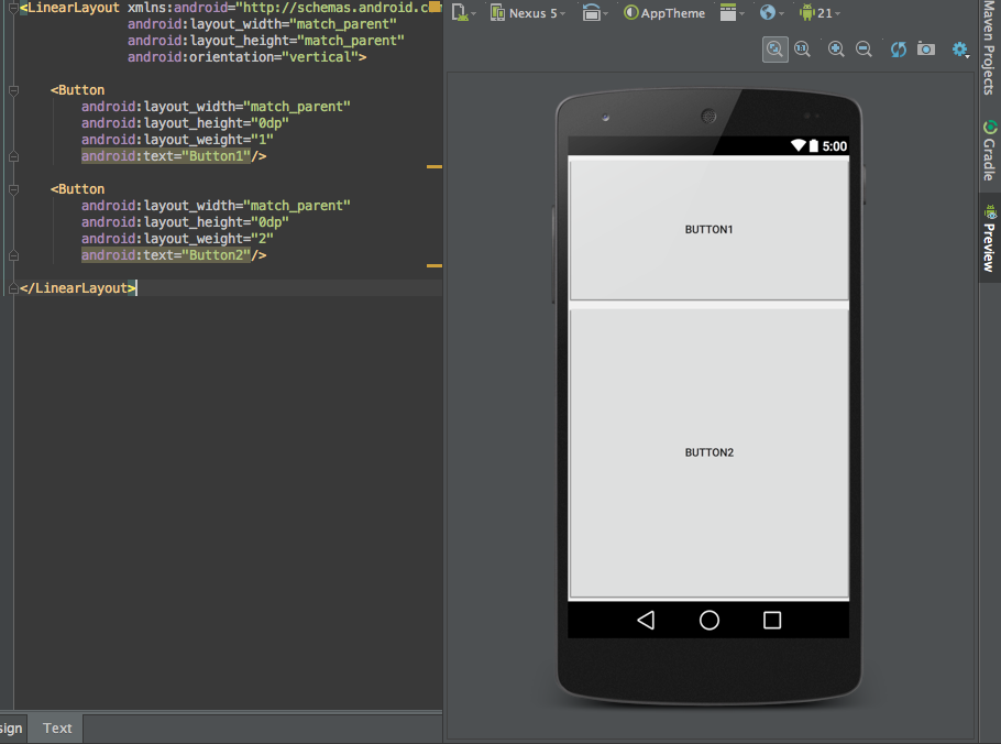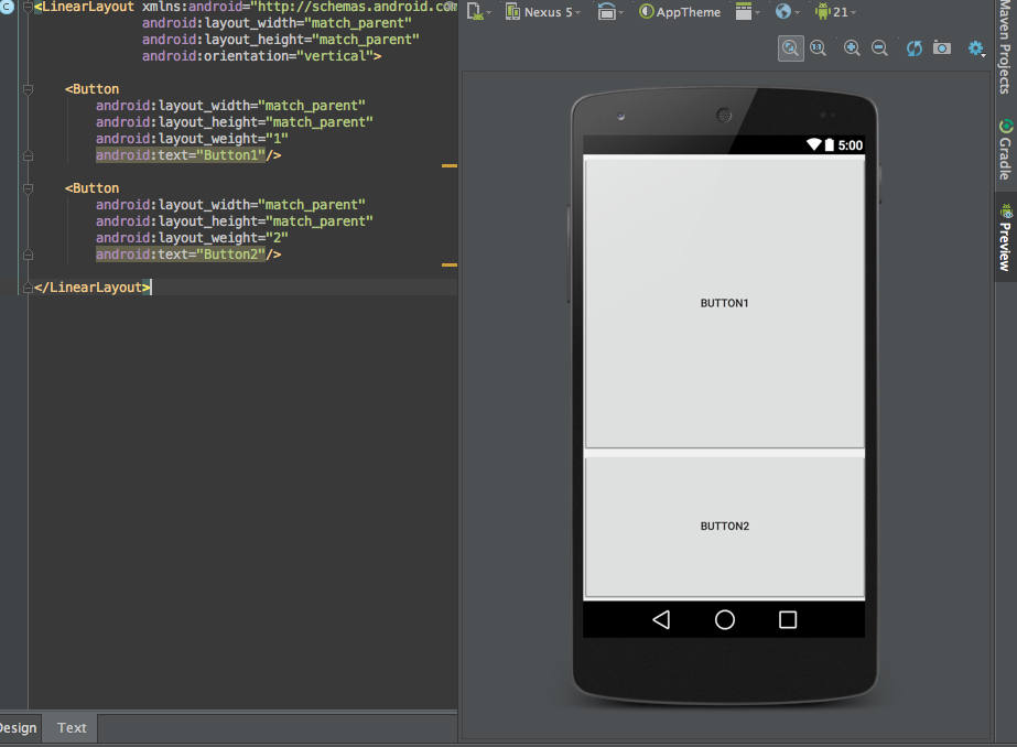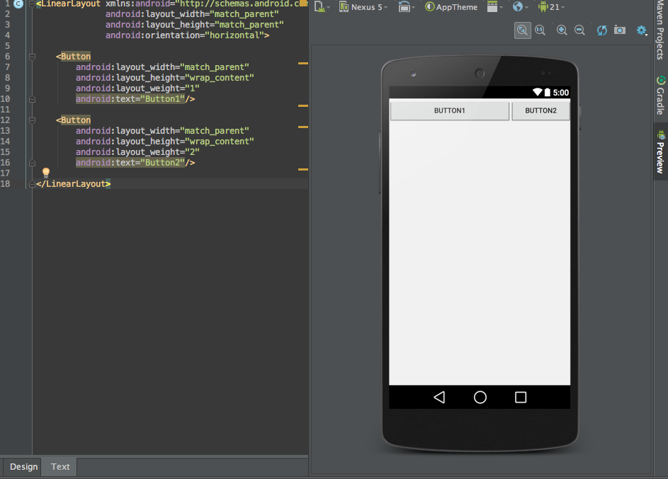 我們在布局裡面設置為線性布局,橫向排列,然後放置兩個寬度為0dp的按鈕,分別設置weight為1和2,在效果圖中,我們可以看到兩個按鈕按照1:2的寬度比例正常排列了,這也是我們經常使用到的場景,這是時候很好理解,Button1的寬度就是1/(1+2) = 1/3,Button2的寬度則是2/(1+2) = 2/3,我們可以很清楚的明白這種情景下的占比如何計算。