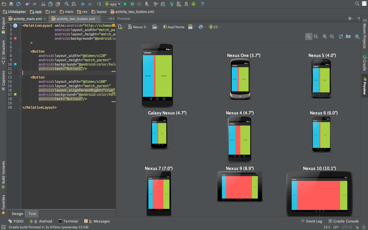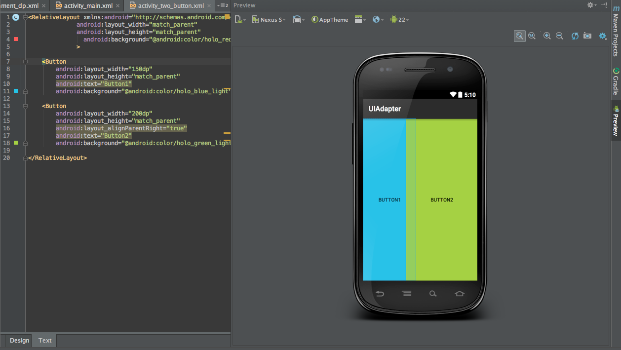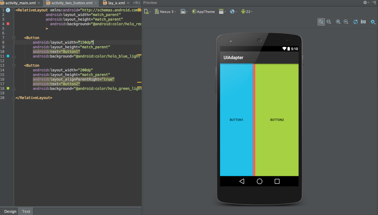 下圖還是兩個Button,不同的是,我們把單位換成了我們在values文件夾下dimen的值,這樣在你指定的分辨率下,不管寬度是320dp、360dp,還是410dp,就都可以完全適配了。