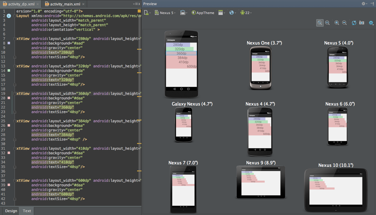 雖然說dp可以去除不同像素密度的問題,使得1dp在不同像素密度上面的顯示效果相同,但是還是由於Android屏幕設備的多樣性,如果使用dp來作為度量單位,並不是所有的屏幕的寬度都是相同的dp長度,比如說,Nexus S和Nexus One屬於hdpi,屏幕寬度是320dp,而Nexus 5屬於xxhdpi,屏幕寬度是360dp,Galaxy Nexus屬於xhdpi,屏幕寬度是384dp,Nexus 6 屬於xxxhdpi,屏幕寬度是410dp。所以說,光Google自己一家的產品就已經有這麼多的標准,而且屏幕寬度和像素密度沒有任何關聯關系,即使我們使用dp,在320dp寬度的設備和410dp的設備上,還是會有90dp的差別。當然,我們盡量使用match_parent和wrap_content,盡可能少的用dp來指定控件的具體長寬,再結合上權重,大部分的情況我們都是可以做到適配的。